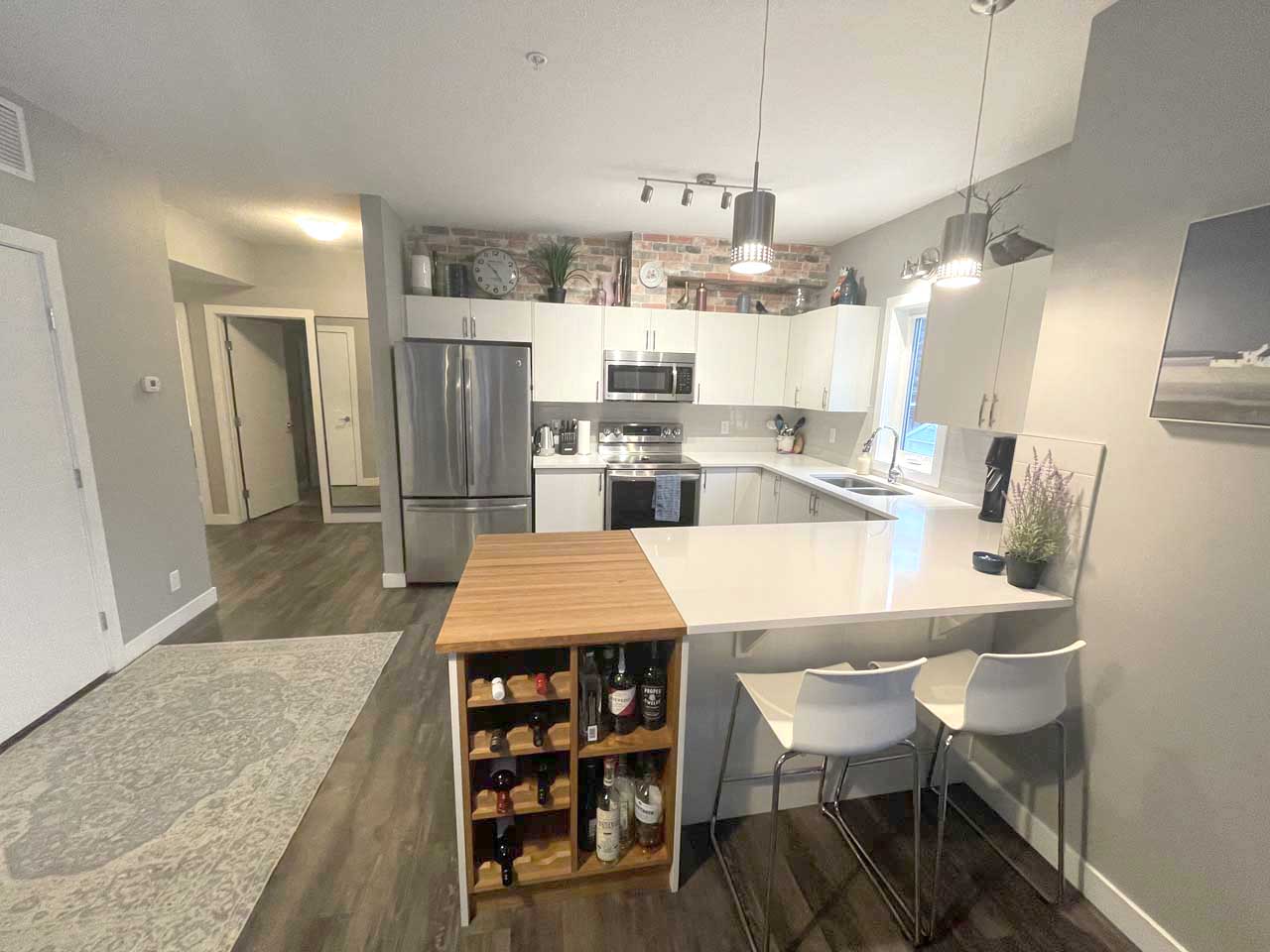 FANTASTIC 2 bedroom, 2 bathroom + den condo in the heart of Bonnie Doon! This bright, open concept plan boasts South, East and North views. Modern kitchen with ample storage and quartz countertops. Walk through closet from master bedroom to ensuite. Premium appliances – washer/dryer, fridge, dishwasher and range. Includes two parking stalls, one in heated parkade and one outdoor covered stall. You are sure to appreciate the secure, heated underground parking. Additional storage in parkade and balcony. This is a well managed building. Includes use of a social room, and large patio. Pet friendly condo. A great location close to culture, cafes, Mill Creek Ravine, LRT, Bonnie Doon mall, and downtown. You will love living at Le Quartier!